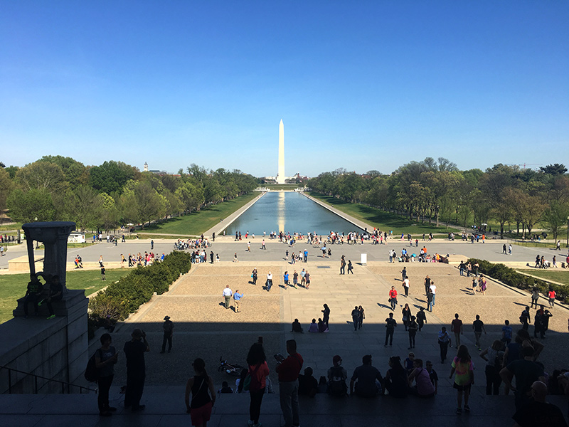 O Washington Memorial reflete no espelho d’água em frente ao Lincoln Memorial / Tuka Pereira