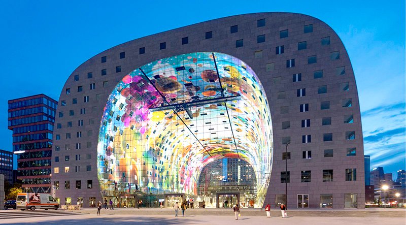 Quem adora viajar tanto pelos lugares quanto pelos sabores destes lugares, um destino delicioso é Market Hall (Markthal) que fica numa região bastante animada da cidade. O espaço charmoso lembra o clima de agito (e variedade de produtos) do Mercado Municipal de São Paulo. No entanto, as similaridades param por aí, já que o mercado de Roterdã possui uma arquitetura tão moderna quanto surpreendente: seu formato é o de um gigantesco hangar e há uma série de painéis coloridos no teto e paredes.