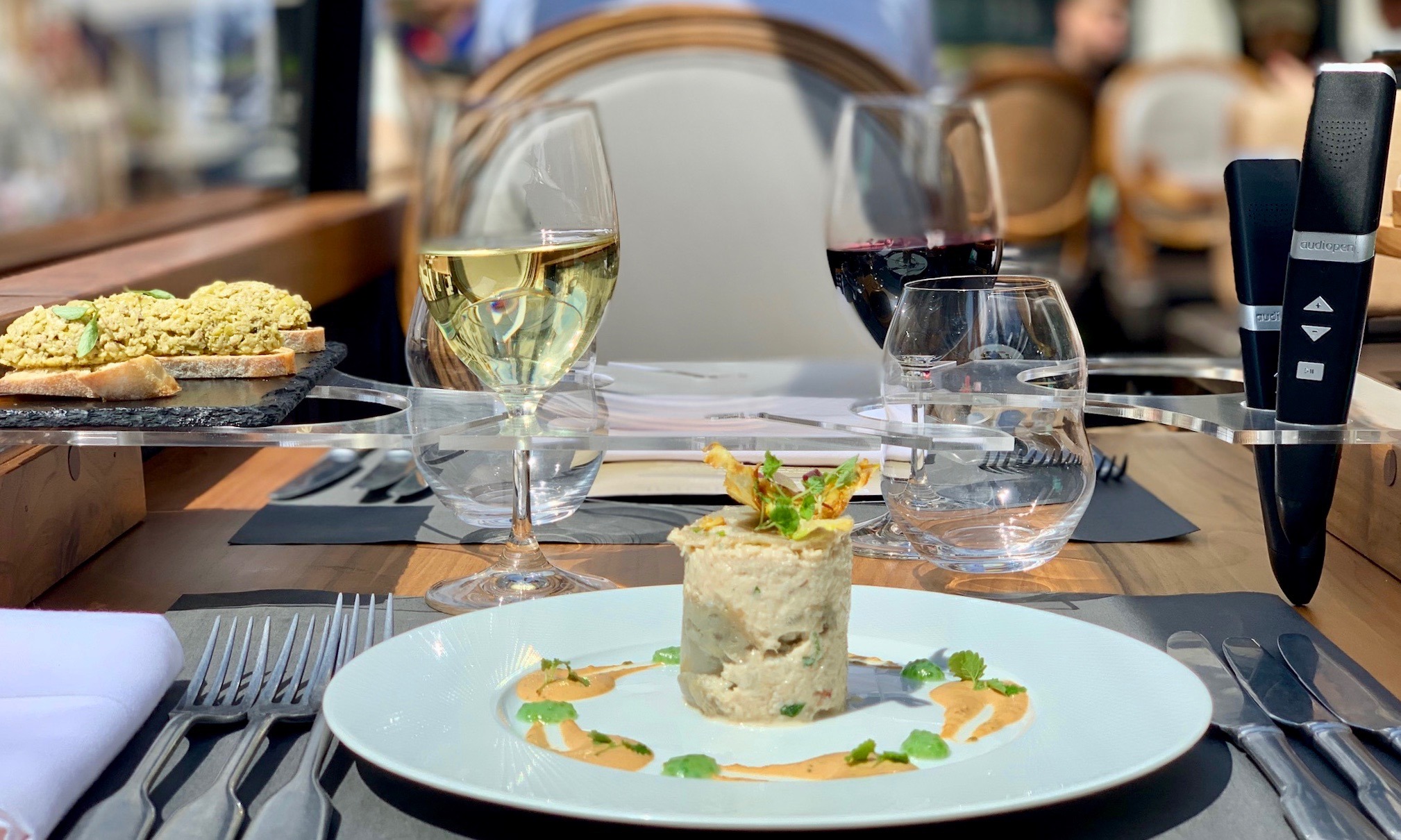 Todos os copos e taças ficam dispostos em displays acrílicos feitos sob medida para encaixá-los perfeitamente e as louças e talheres ficam sobre um tecido de material aderente. Assim é realmente impossível – ou muito difícil – acontecer algum acidente, mesmo com os mais desastrados como esta jornalista que vos escreve: até o final da jornada algumas taças de vinho balançaram, mas nenhuma gota foi derramada, posso garantir.