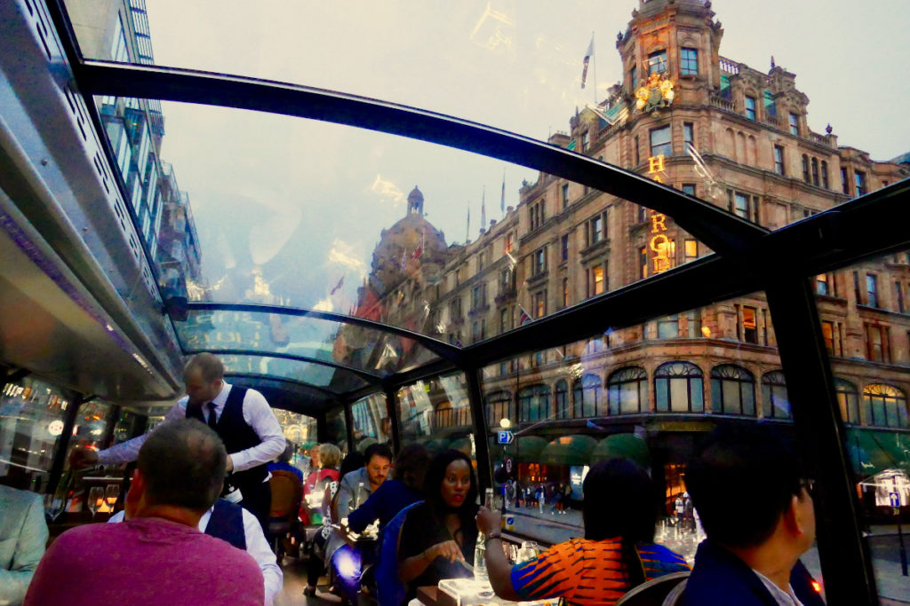 Enquanto as refeições são servidas, o ônibus anda lentamente pela cidade, pois, afinal, o trânsito é o mesmo existente em qualquer grande metrópole do mundo. No entanto, a lentidão do lado de fora é até vantajosa para quem está dentro, já que através da cúpula de vidro do veículo vemos passar a Catedral de St Pauls, Tower Bridge, o Big Ben, London Eye, o Royal Albert Hall, o Parlamento, a Harrods, o Hyde Park e outros marcos imperdíveis da cidade.