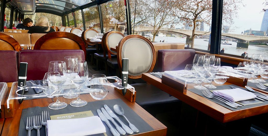 No jantar a aventura começa no Victoria Embankment, às margens do Rio Tâmisa, às 19h15 ou 19h30. Durante o Verão, neste horário o sol ainda não se pôs e é possível ver o céu se transformar em pleno passeio: um belo espetáculo. A vista é privilegiada independente do lugar já que todas as mesas ficam no andar superior que possui teto panorâmico. No andar inferior estão a cozinha do restaurante e os banheiros.